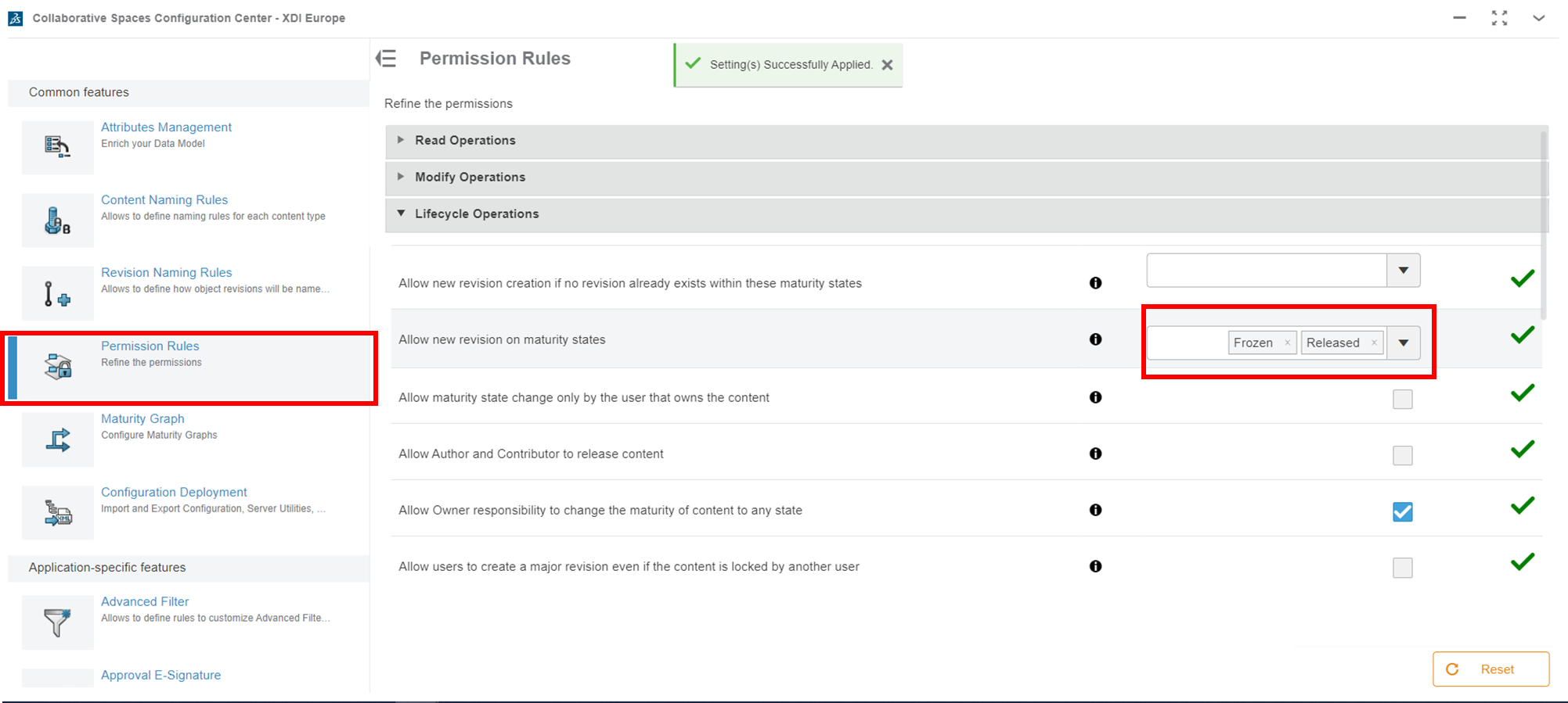 Par défaut, le Responsable du 3DSpace peut toujours modifier le contenu "gelé". Désactivez cette option pour éviter cela.