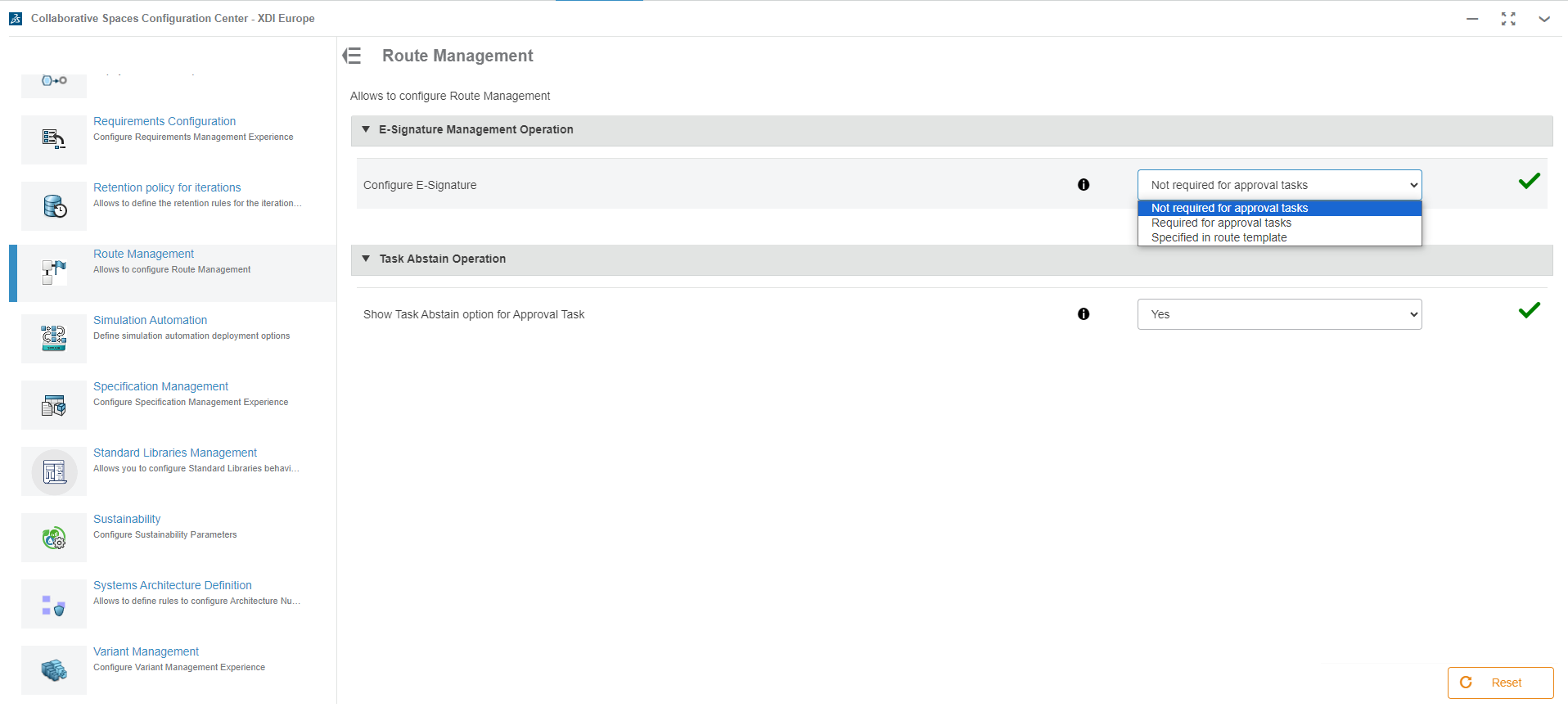 Quando a tarefa é validada, podes optar por assinar a aprovação eletronicamente (o que pode ser útil para cumprir determinadas normas). Esta opção é definida na aplicação do Centro de Configuração de Espaço Colaborativo -> Route Management