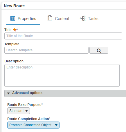 Seleciona"Promover objectos ligados" como"Ação na conclusão do itinerário", para que os ficheiros se tornem automaticamente"Distribuídos" após a validação do itinerário.