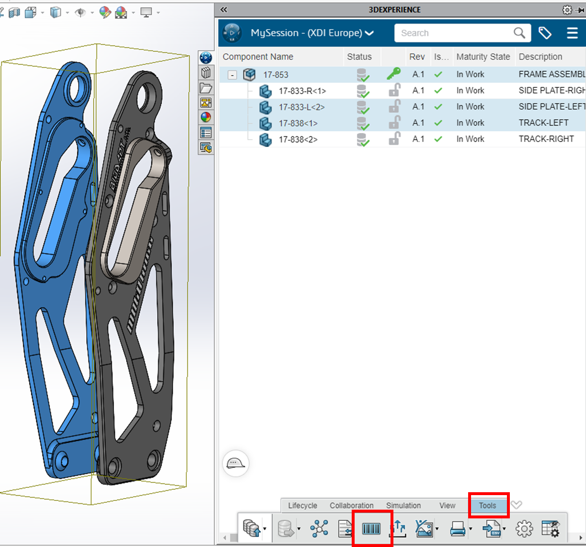 No separador 3DEXPERIENCE à direita do ecrã, denominado MySession, seleciona os componentes a codificar: