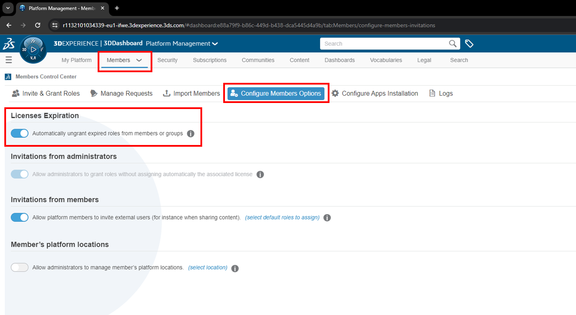O administrador da plataforma deve ir ao painel de controlo"Gestão da plataforma" e, em seguida, ativar a opção "Remover funções expiradas automaticamente":