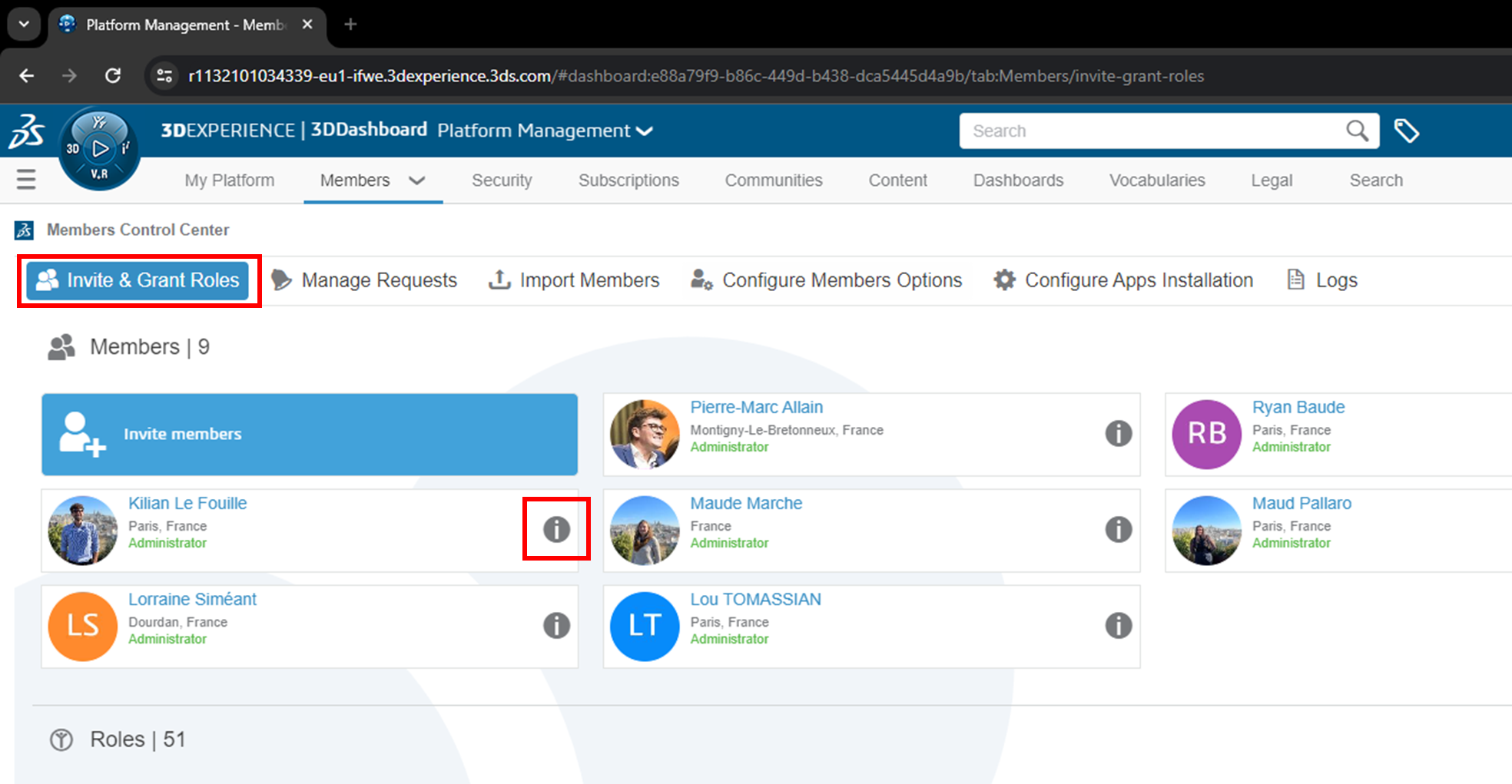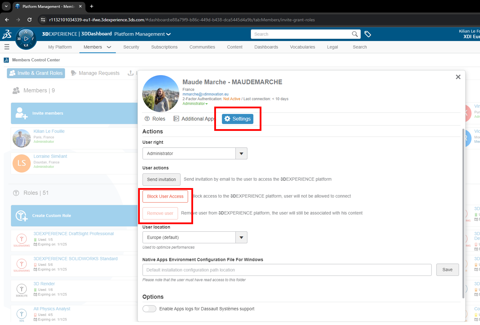 Ainda no Dashboard"Gestão da Plataforma", elimina os acessos dos membros que deixarão de ter acesso ao 3DEXPERIENCE após a renovação: