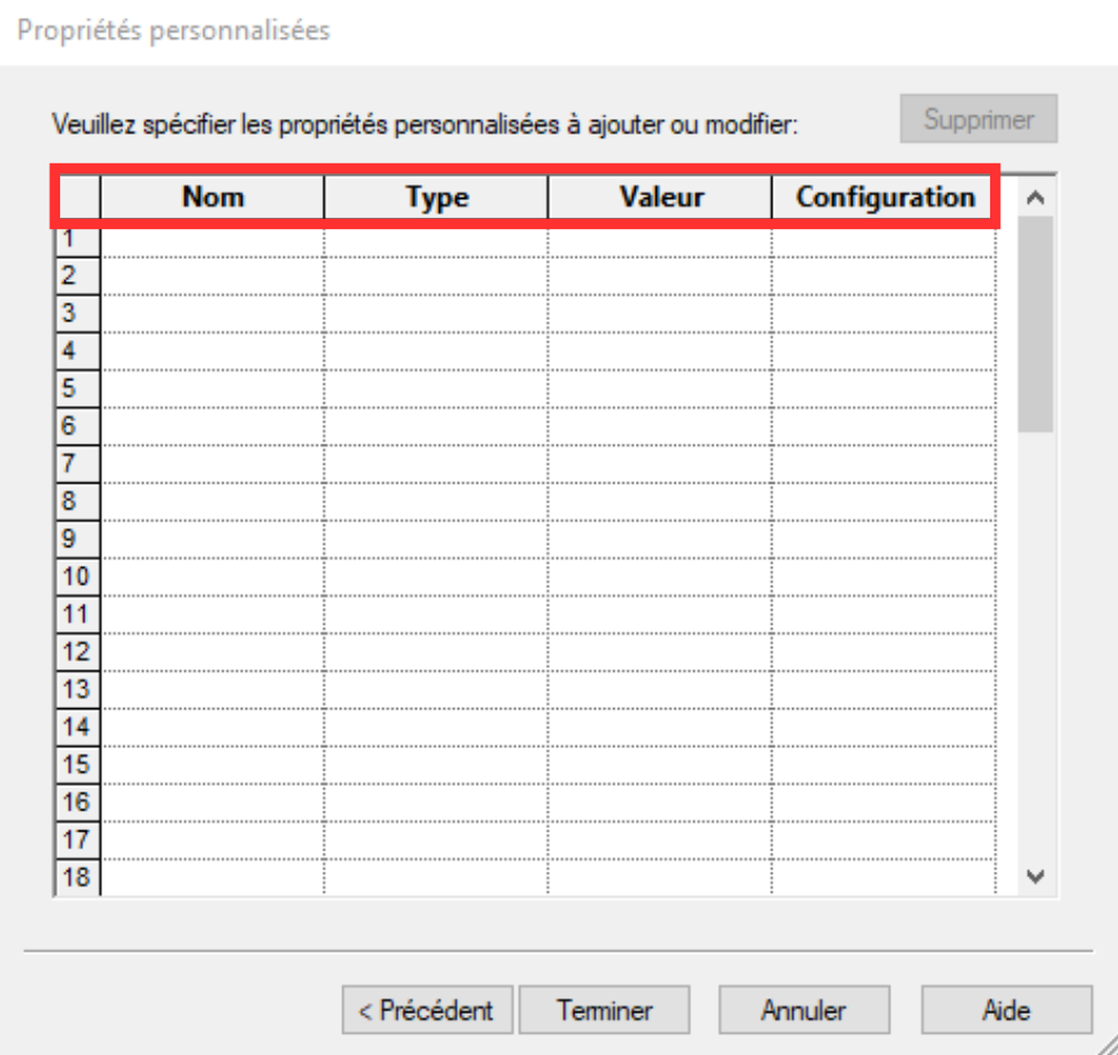 - Dans la fenêtre suivante, pour chaque propriété à ajouter/modifier, remplissez les champs "Nom", "Type", "Valeur". Vous pouvez vous servir du menu déroulant.